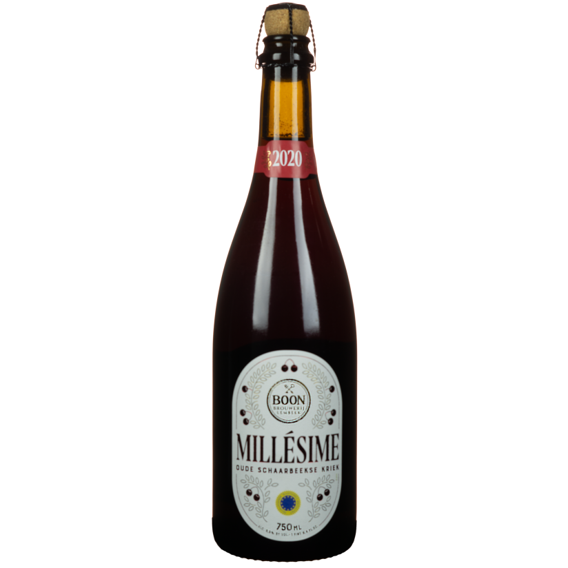 For this traditional fruit beer, Schaerbeek cherries were harvested in the summer and fermented with lambic that had already matured for 18 months in wooden barrels. A generous 270 grams of cherries were used per liter. The young cherry lambic was then aged for another 6 months in large oak casks, after which the beer was bottled. The Boon Millésime undergoes refermentation in the bottle and can easily be aged for several more years.